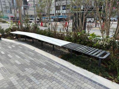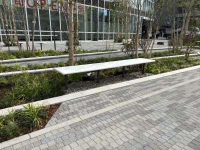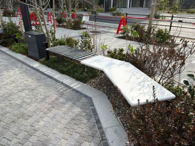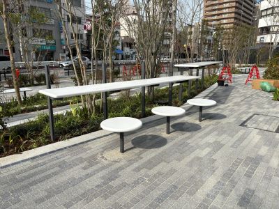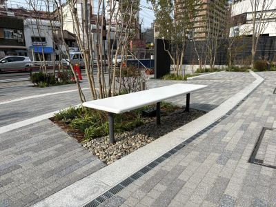 2026/04/29 ジオタワー大阪十三 人工大理石ベンチ 大阪十三ジオタワー前の共有スペースに人工大理石のベンチとかまどベンチを設置しました。 色のトーンが絶妙にマッチしていて、見ていてとても心地いいバランスです 格子部分は非常時に、炊き出し用にかまどとして使用します。